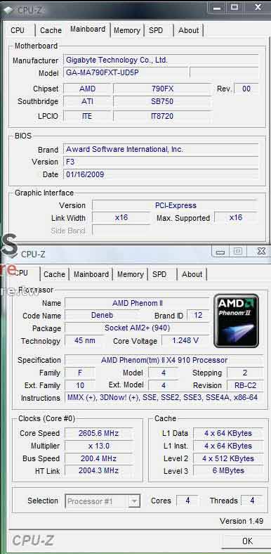 Тайваньское зеркало сайта Tomshardware.tw разместило на своих страницах обзор процессора AMD Phenom II 910 в исполнении Socket AM3, рабочая частота которого 2,6 Ггц. Коллеги собрали тестовый стенд, в основе которого была материнская плата Gigabyte GA-MA790FXT-UD5P построенная на базе связки AMD 790FX и SB750. Необходимо сказать, что данная плата является флагманским решением от компании Gigabyte для процессоров рассчитанных на установку в гнездо AM3. Изделие поддерживает память DDR3, которая может работать на частоте до 1666 МГц. Также в состав стенда входила оперативная память Corsair DDR3-1333 (1 Гб Х 2) и видеокарта Gigabyte GV-RX26T256H (Radeon HD2600 XT) Gigabyte GV-RX26T256H.